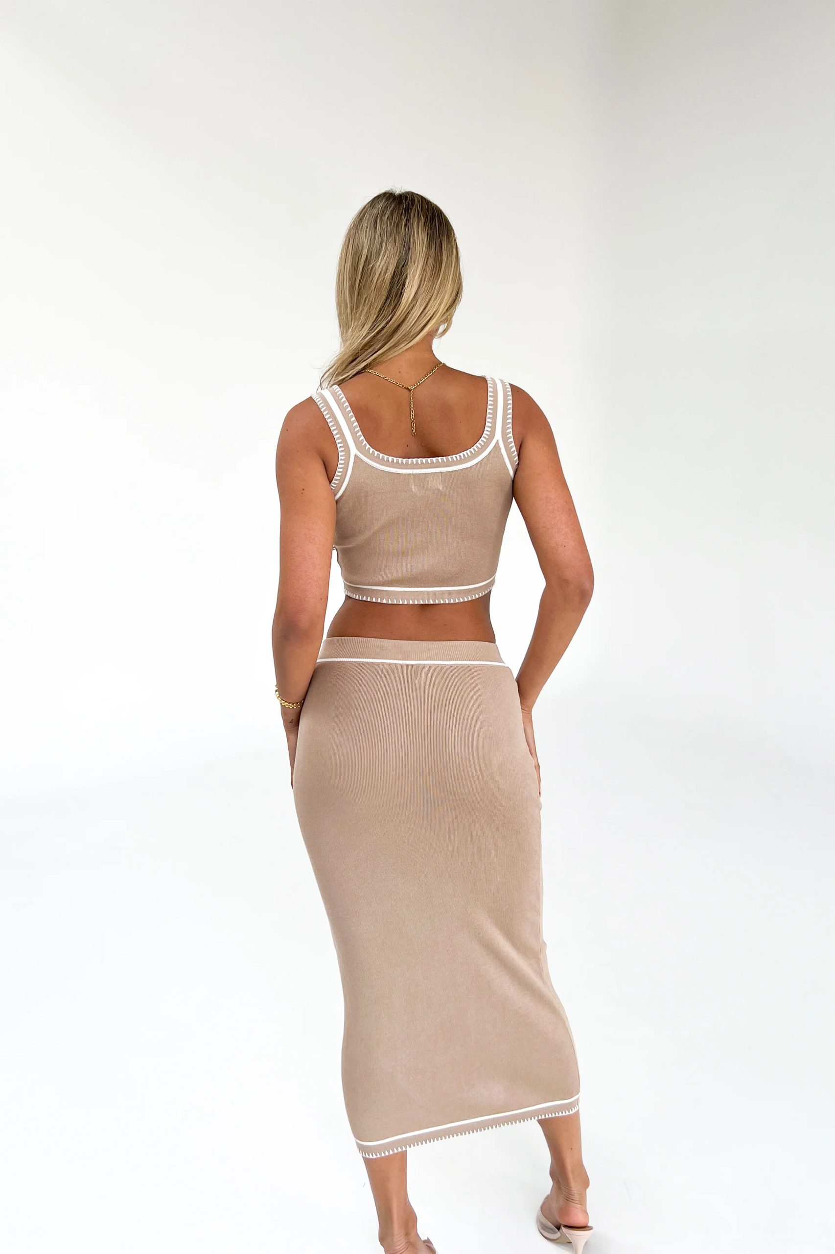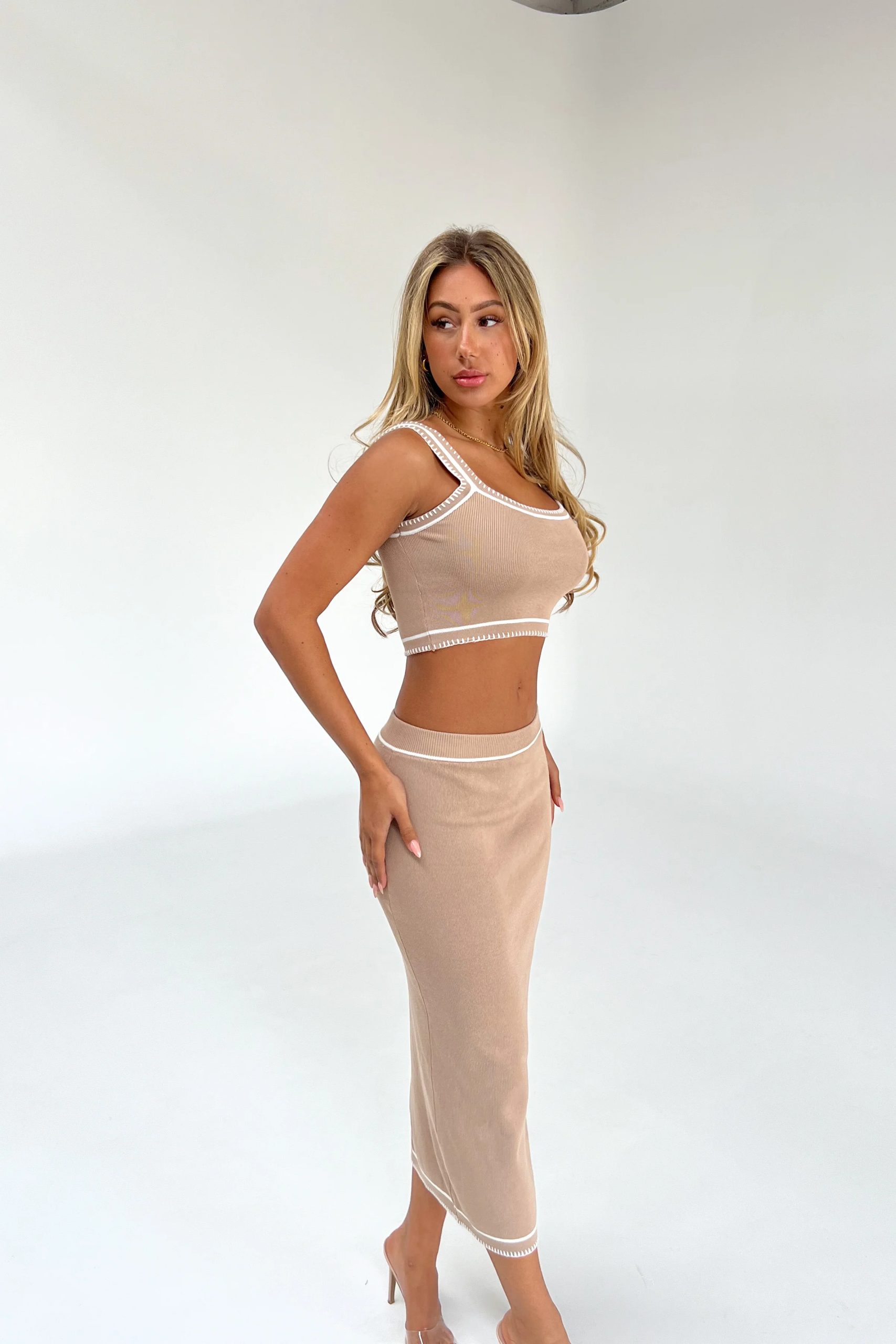 This charming two-piece set is crafted from a soft and breathable knit fabric, offering both style and comfort. The top features a fitted design with thin straps that elegantly outline the shoulders and neckline, creating a sharp, contemporary look. The skirt, designed to complement the top, drapes gracefully to a midi length, enhancing your silhouette with its sleek finish.