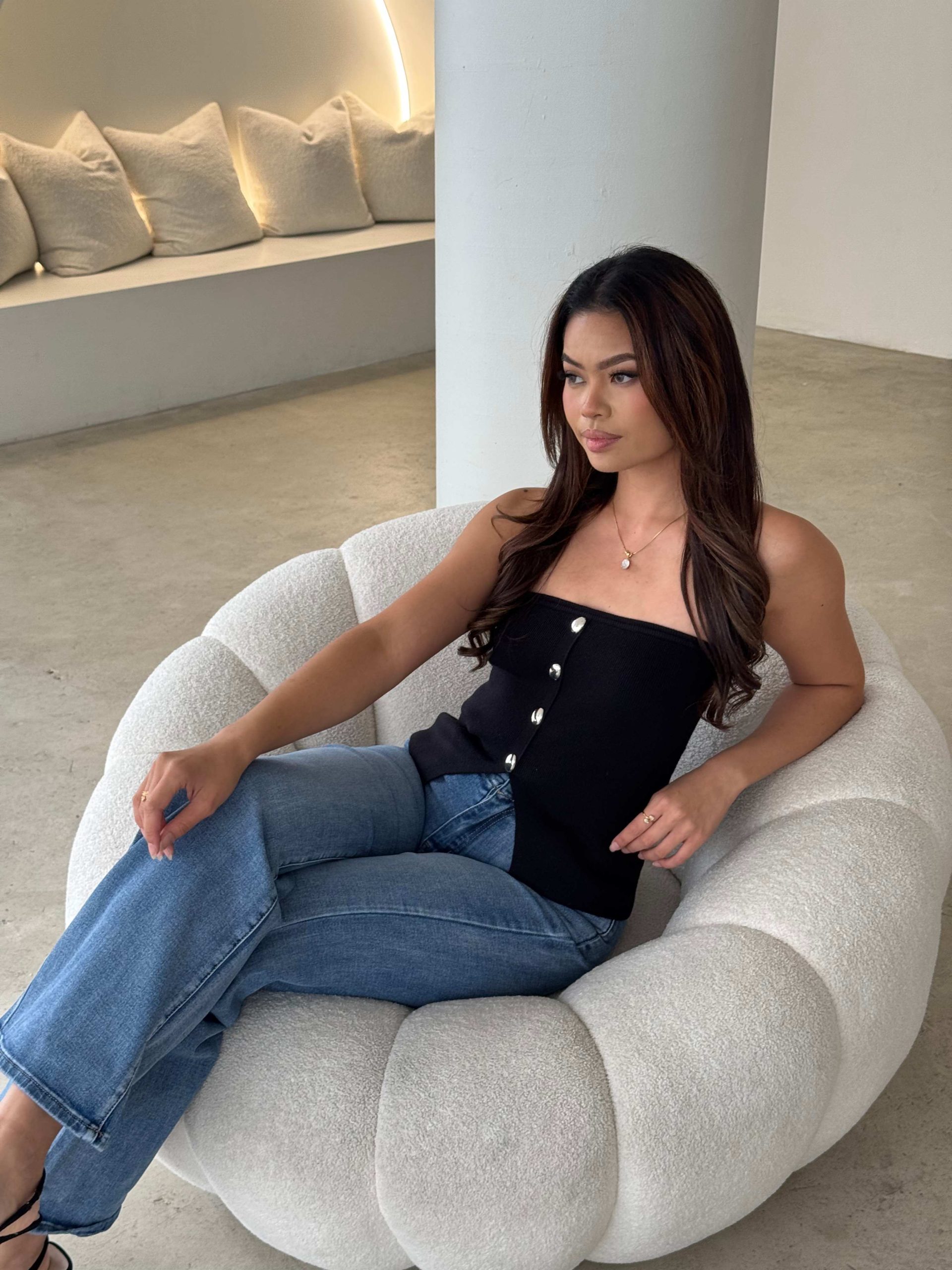 This chic strapless knit top is perfect for those who love to blend style with comfort. Designed in an elegant black hue, it provides an easy-to-match base for any outfit. The pearl-like buttons running down the center add a touch of sophistication and charm, making it suitable for both casual and formal occasions.