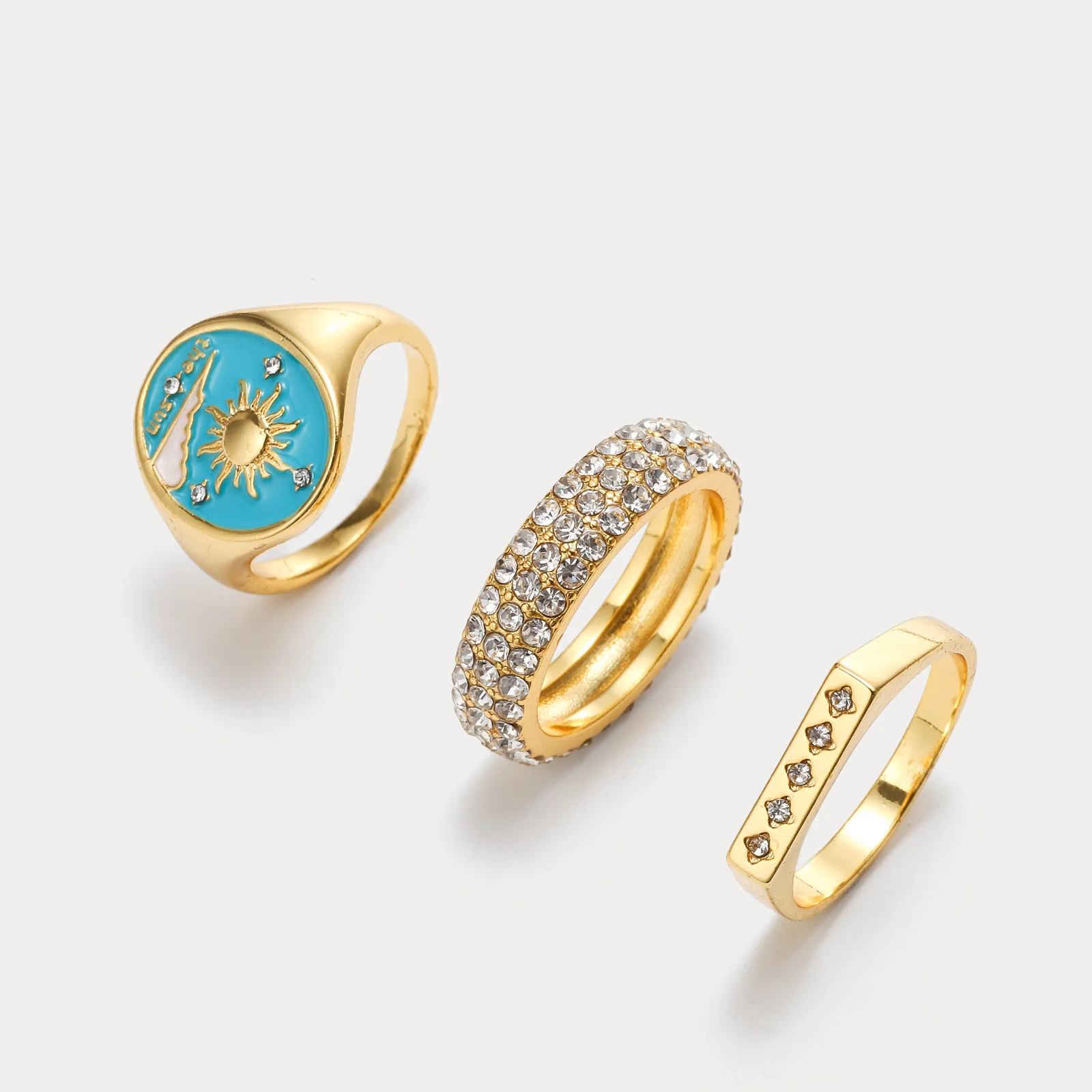 The second ring boasts a vibrant turquoise enamel face with a delicately engraved sun emblem, surrounded by small rhinestones, all set onto an alloy base. This ring enhances a sense of personalization and vibrance to your ensemble.