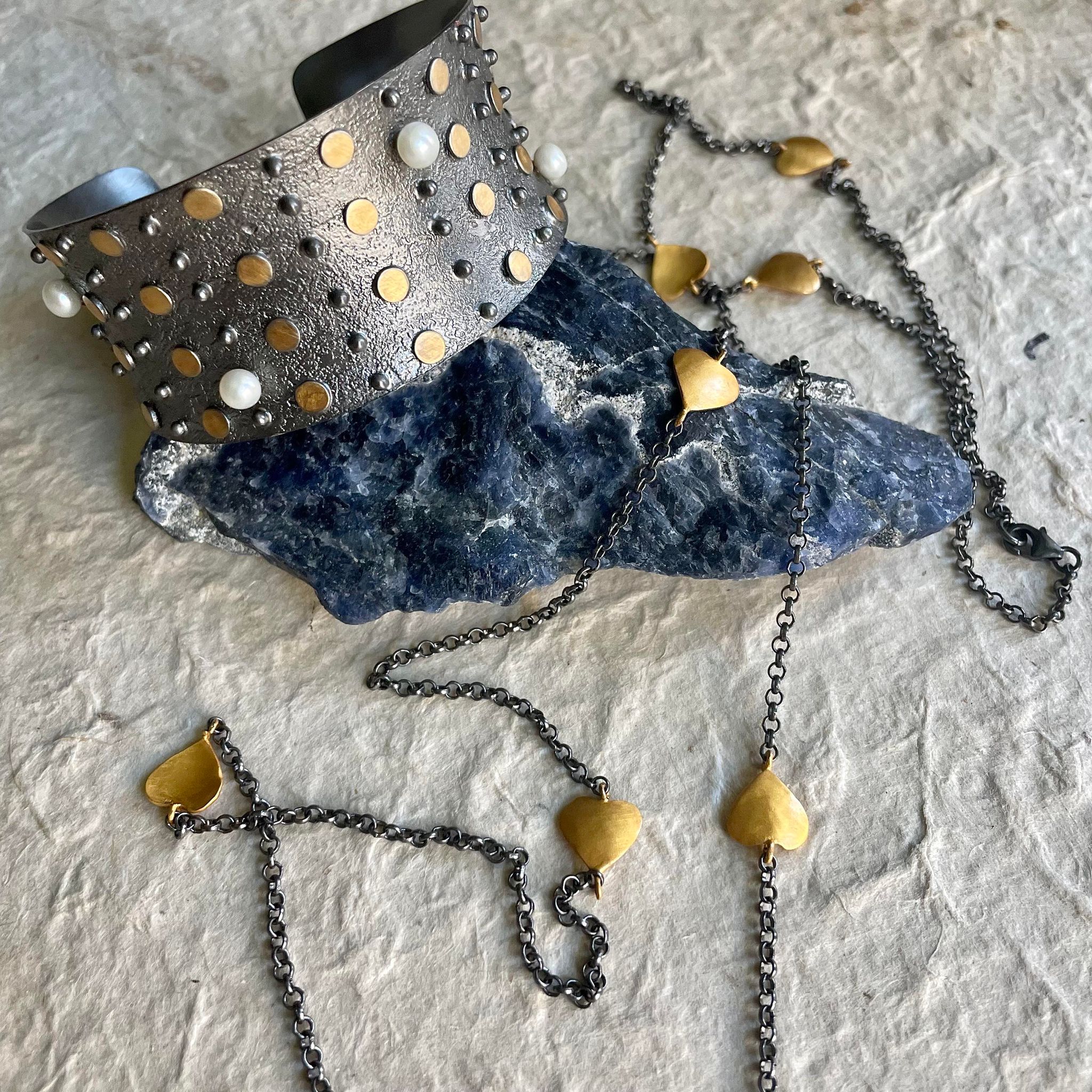 This striking bracelet is crafted with care using high-quality black alloy, known for its durability and lightweight design. Its textured surface adds an edgy appeal, while the polished gold-toned dots and delicate embedded faux pearls bring a touch of sophistication to the overall design. The bracelet strikes a balance between boldness and elegance, making it perfect for casual outings and special occasions alike.