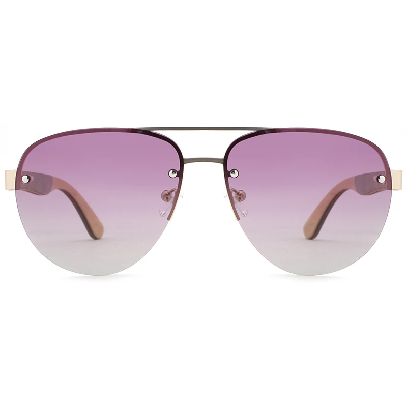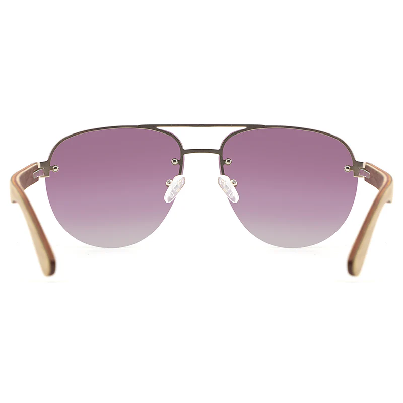 The frame is crafted from durable stainless steel with a soft brushed finish, ensuring a blend of sturdiness and style. The temples are made from high-quality wood-like plastic, providing an eco-friendly aesthetic while remaining lightweight and budget-friendly. The gradient purple lenses add a touch of sophistication, seamlessly transitioning from a deep violet hue to a soft transparency at the bottom.